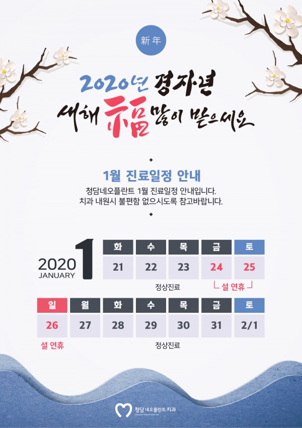 청담네오플란트치과2020년 1월 진료일정안내 페이지 정보 작성자 최고관리자 작성일 19-12-27 10:19 조회 3,364회 댓글0건 관련링크 이전글 신종 코로나바이러스 안내드립니다. 다음글 10월 휴진일정 및 진료일정 안내 목록 답변 본문 구정연휴는 1월24일 금요일~26일 일요일까지만 휴진입니다. 27일 월요일은 정상진료입니다. 감사합니다. 댓글 목록 등록된 댓글이 없습니다. 댓글등록 이전글 신종 코로나바이러스 안내드립니다. 다음글 10월 휴진일정 및 진료일정 안내 목록 답변