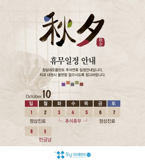 [휴무안내] 2017 청담네오플란트 추석휴무 안내입니다 페이지 정보 작성자 최고관리자 작성일 17-09-16 19:10 조회 3,413회 댓글0건 관련링크 이전글 [휴무안내] 2018 청담네오플란트 가정의달 휴무 안내입니다. 다음글 청담네오 플란트 입니다. 2017년 봄을 맞아 새로 홈페이지를 단장 했습니다. ^ - ^ )* 목록 답변 본문 [휴무안내] 2017 청담네오플란트 추석휴무 안내입니다 댓글 목록 등록된 댓글이 없습니다. 댓글등록 이전글 [휴무안내] 2018 청담네오플란트 가정의달 휴무 안내입니다. 다음글 청담네오 플란트 입니다. 2017년 봄을 맞아 새로 홈페이지를 단장 했습니다. ^ - ^ )* 목록 답변